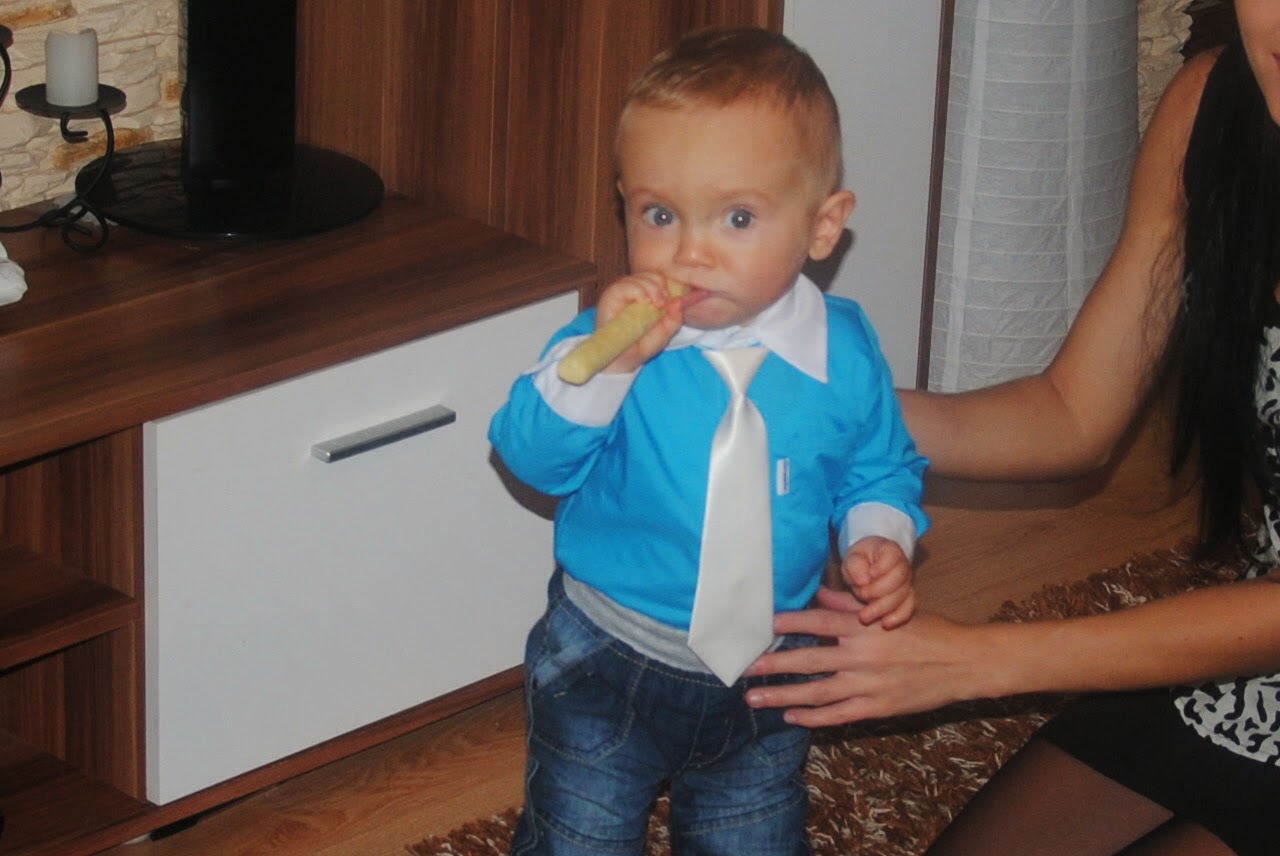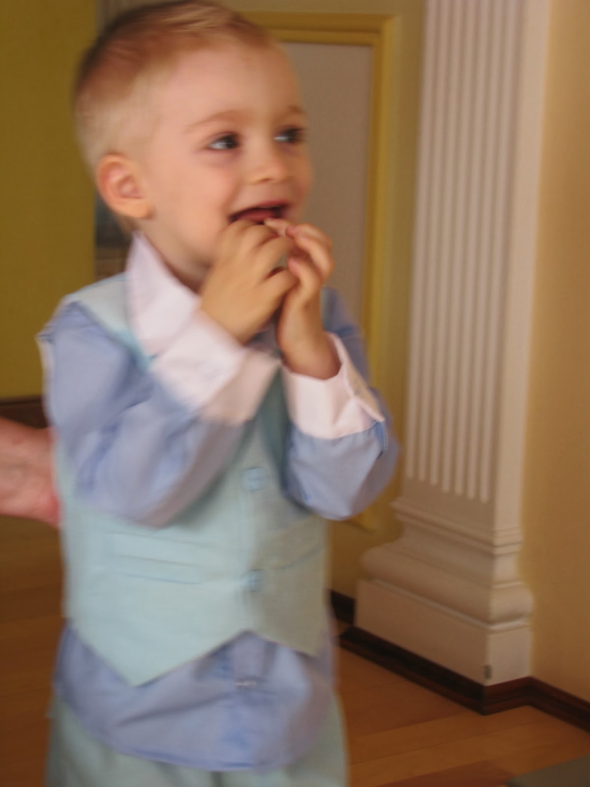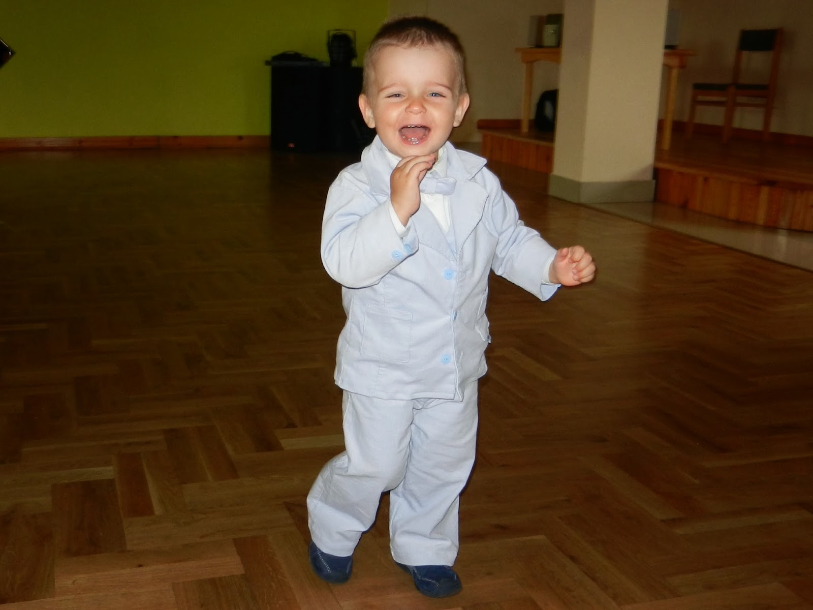 Potem pomalutku podchodził do nas- ubrał wreszcie spodenki i marynarkę- bardzo lubi jak bijemy mu brawo:). czy nie jest uroczy w garniturku?